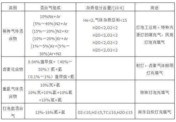 電光源混合氣主要用作白熾燈、特種光源燈(如紅外線燈、強(qiáng)烈溢光燈、熒光燈、發(fā)光信號(hào)、太陽燈、臭氧燈、光化學(xué)燈、滅菌燈、紫外線燈、輝光燈、鋯弧...